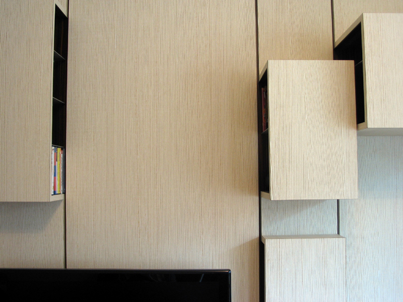 tv kast, wandpanelen met vakken die aan de voorzijde gesloten zijn en open aan de zijkanten